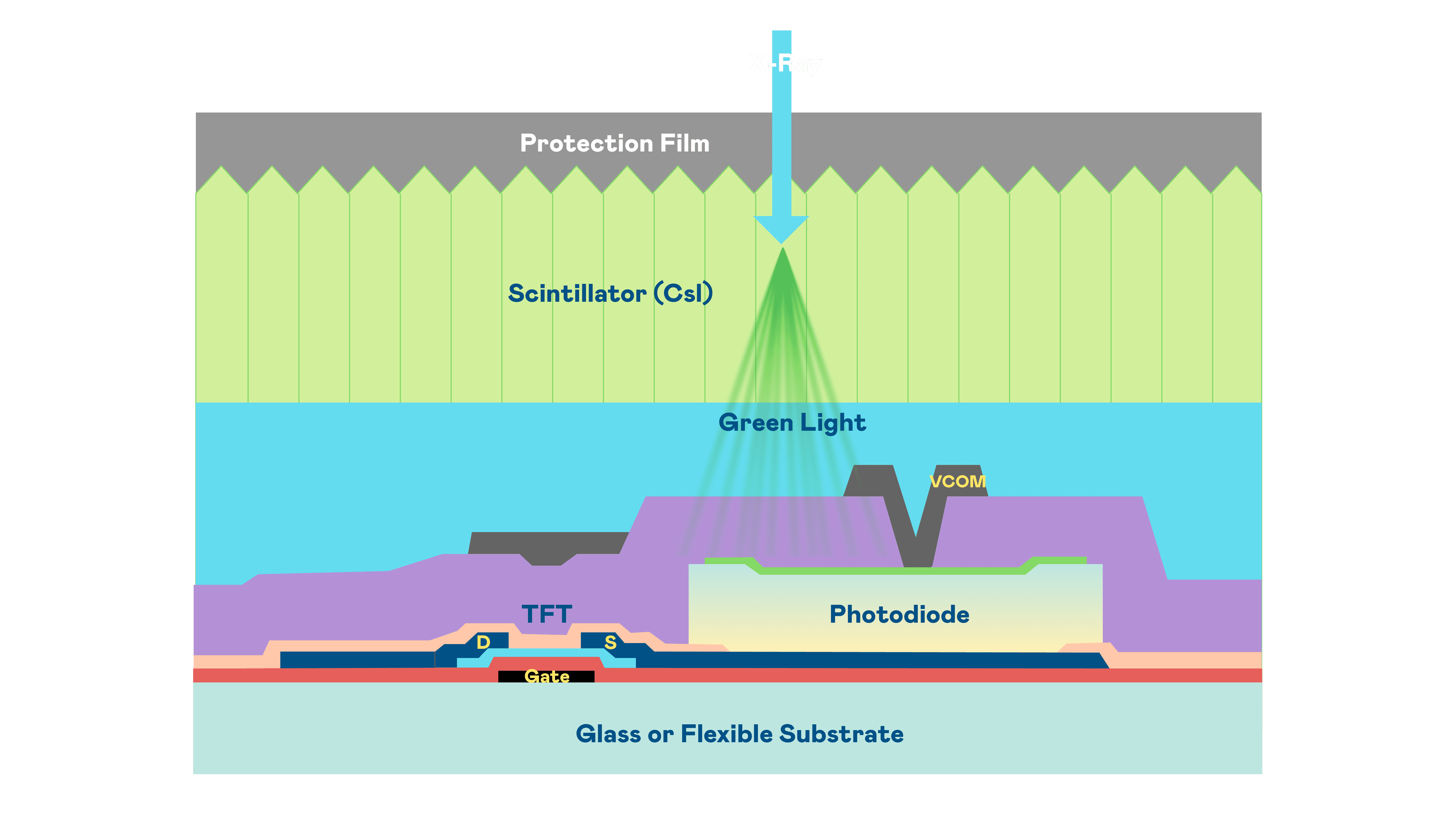 尊时凯龙的X光影像感测阵列使用薄膜电晶体 (TFT) 作为每个像素的读取开关,,,搭配光电二极体(Photodiode)的光电转换元件,,用以感测X光影像讯号。。。。